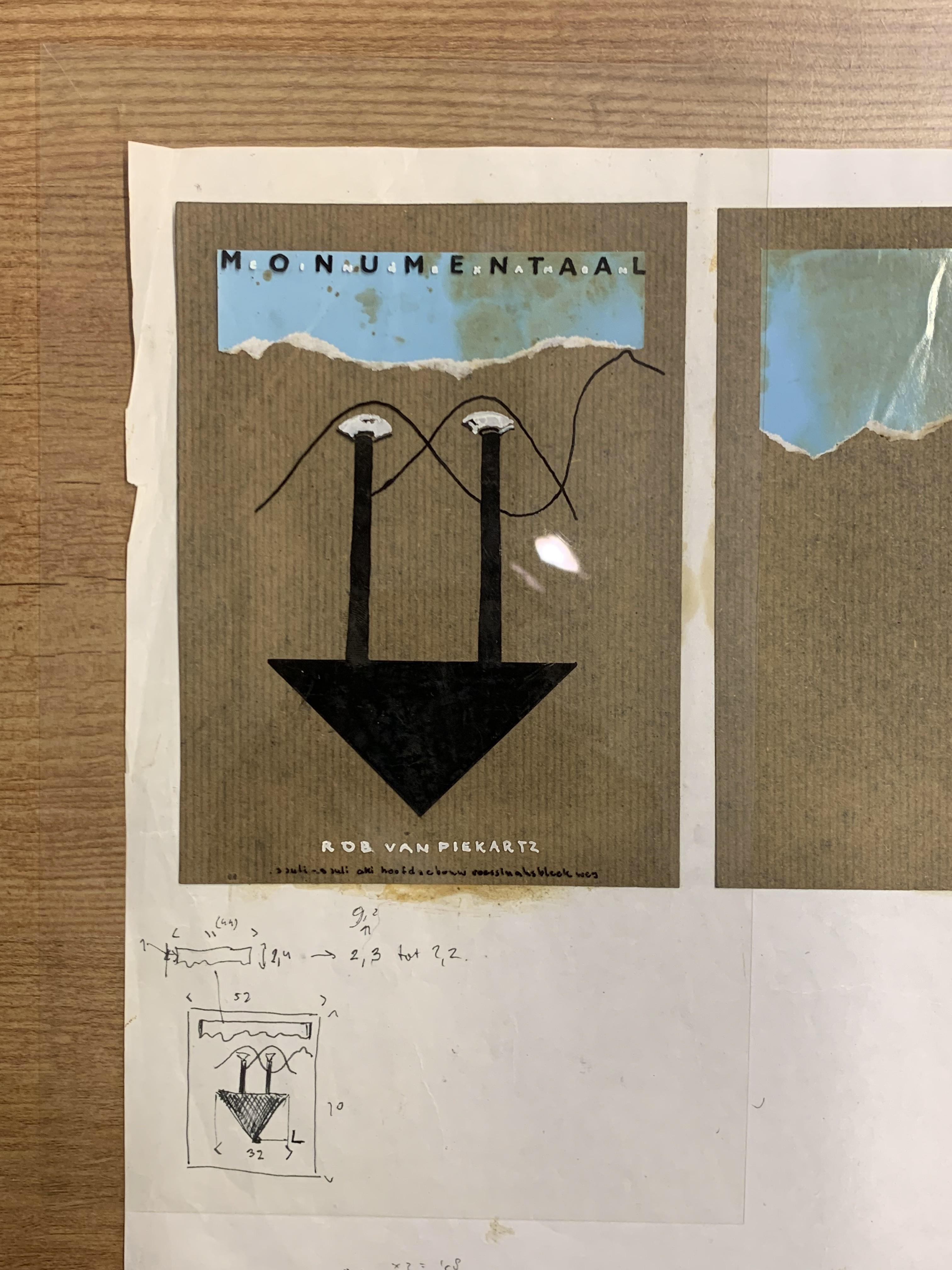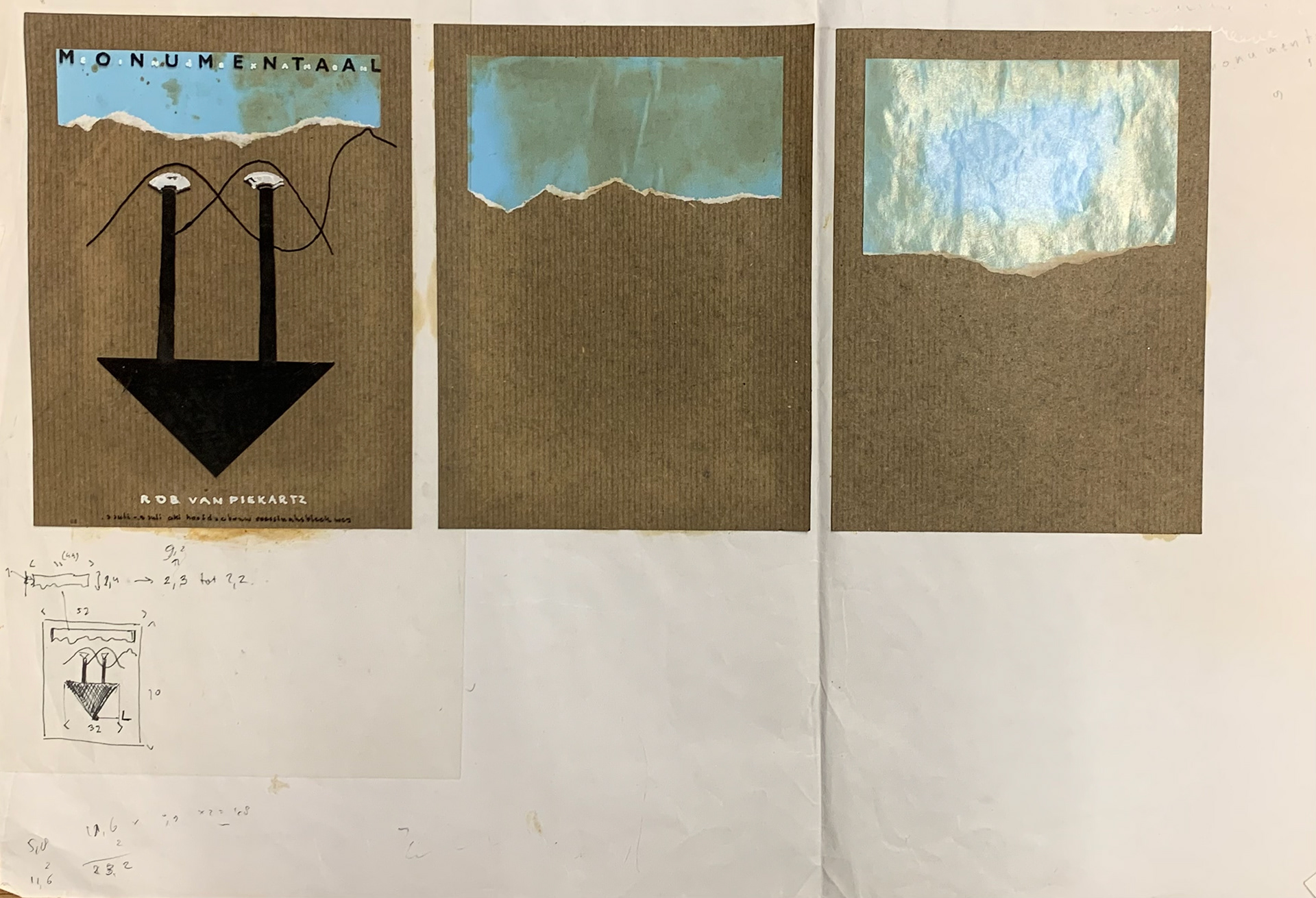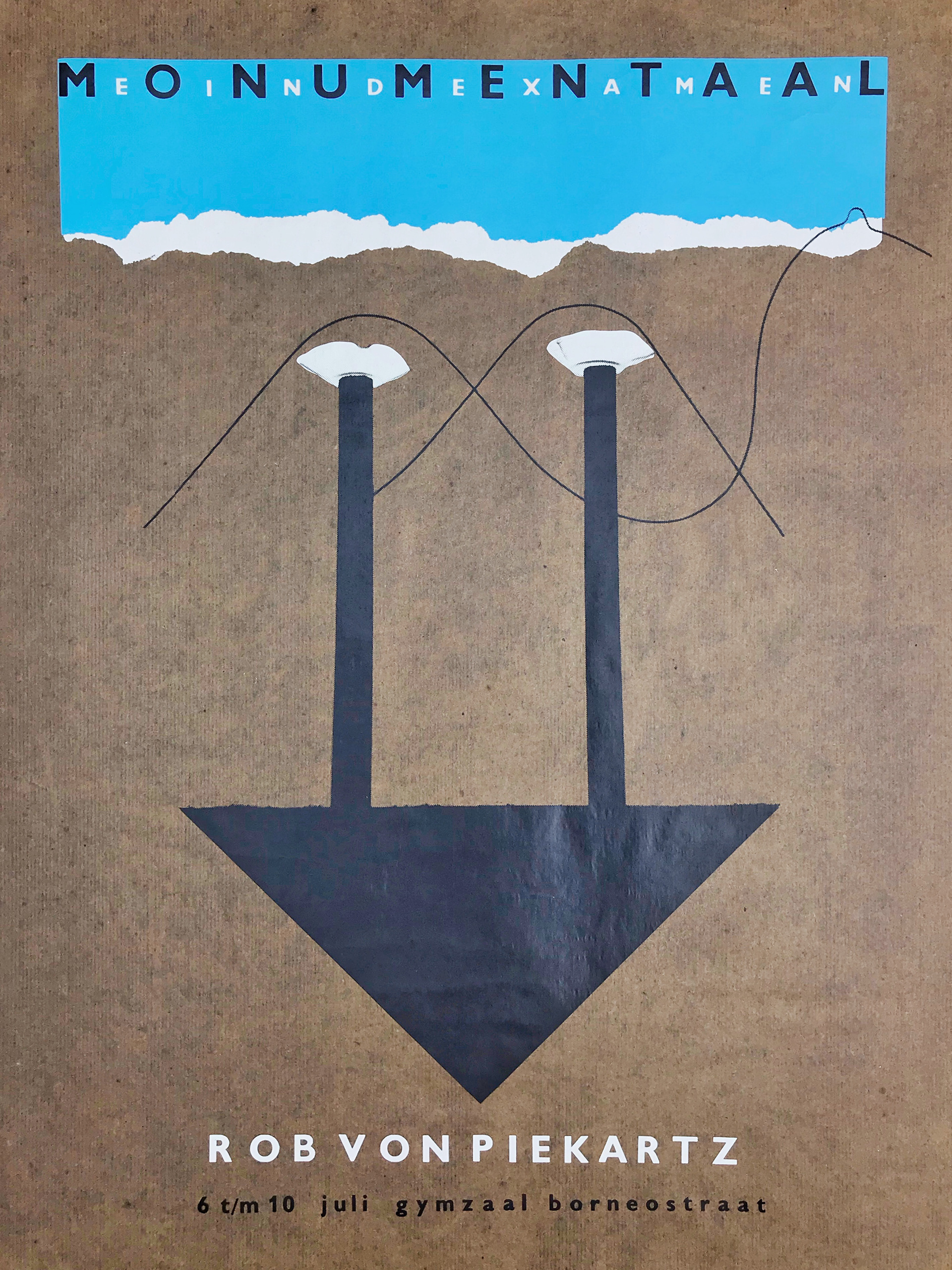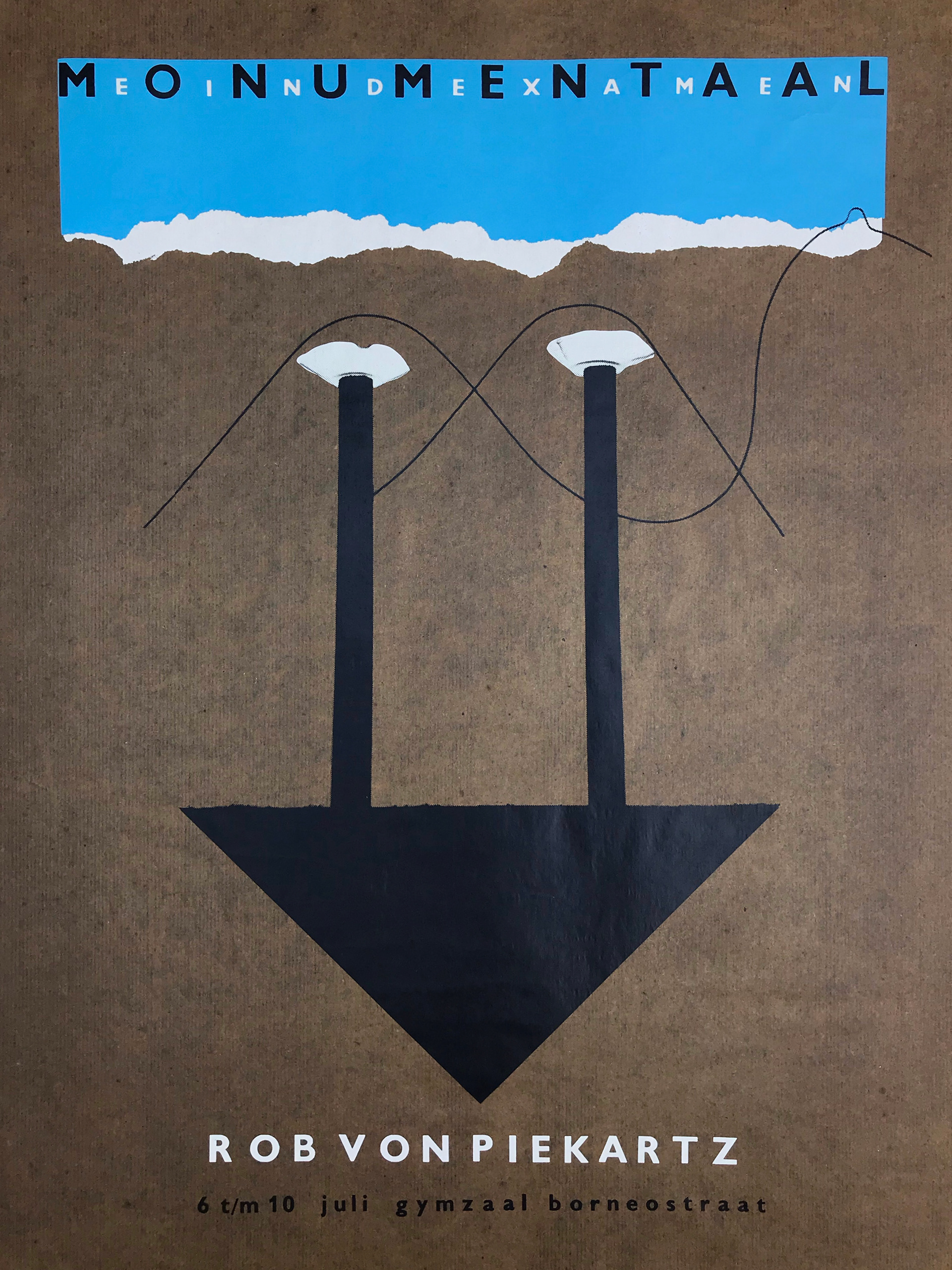 Poster for Artist Rob van Piekartz (1987) Screen print (3 colours) on bitumen (Kraft) paper.